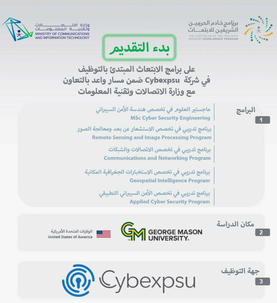 (برنامج خادم الحرمين الشريفين للابتعاث) يعلن فتح باب التقديم على برنامج الابتعاث المبتدئ بالتوظيف في شركة Cybexpsu ضمن مسار واعد أحد مسارات برنامج خادم الحرمين الشريفين للابتعاث الخارجي وذلك بالتعاون مع وزارة الاتصالات وتقنية المعلومات, وذلك وفقاً للتفاصيل والشروط الآتية.