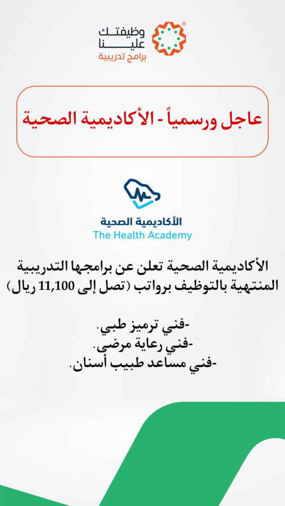 (الأكاديمية الصحية للتخصصات الصحية) تعلن عن برامجها التدريبية المنتهية بالتوظيف، وهي مجموعة برامج تؤهل الكوادر الوطنية للعمل في المراكز والمستشفيات الحكومية، وذلك من خلال التفاصيل الآتية.