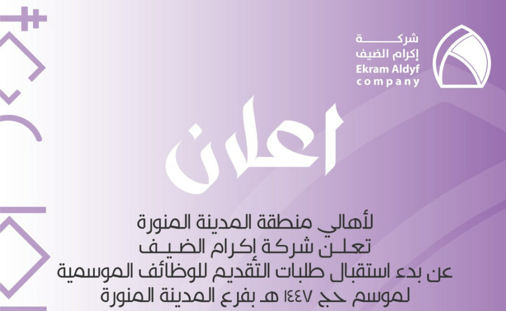 (شركة إكرام الضيف) تعلن عن بدء استقبال طلبات التقديم للوظائف الموسمية لموسم حج 1447هـ بفرع المدينة المنورة، وذلك من خلال التفاصيل الآتية.